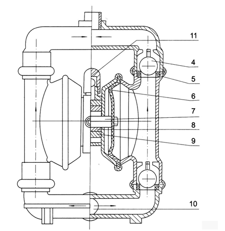1 進氣口 2 配氣閥體 3 配氣閥 4 圓球 5 球座 6 隔膜 7 連桿 8 連桿銅套 9 中間支架 10 泵進口 11 排氣口