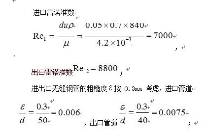 因摩擦系數是雷諾準數與相對粗糙度的函數,經查手冊得,進口管道摩擦系數 λ =0.040,出口管道λ =0.042;