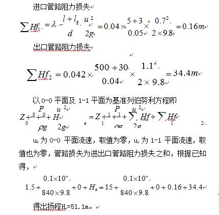 泵進出口管路上管件的當量長度經查手冊得,le1=3m, le2=30m;