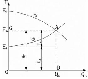 由圖 2所示,設用戶所許流量 QA 減少為 QB,當通過關小閘門來實現時,管阻特性將改變為曲線③,而揚程特性則仍為曲線①,故供水系統的工作點由 A 點移至 B 點。 這時:流量減少了,但揚程卻從 HTA 增大為 HTB;由式二可知,供水功率 PG 與面積 OEBF 成正比。